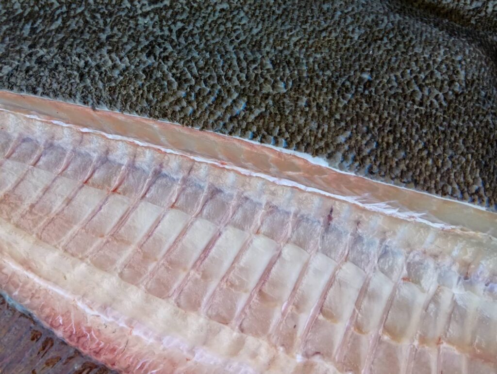 「京さわら」には何やら厳しい基準があるらしいのですが、忘れてしまいました。2本買ってそれぞれ7.2㎏・5.9㎏という立派な魚体。ここまでくると身の味の良さにはかなり期待してしまいます。ただし!肥え方はいいですが、魚形と色艶は「う~~微妙・・・」という感じ。そこそこの脂はあると思いますが、トロのようではないと思います。こちらのさわらも非常に水揚げからの処理がいいので、寝かせながら使うのがおすすめです。